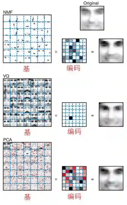 图 4 在人脸表示中,对比VQ(矢量量化)和PCA(主成分分析—矩阵分解),NMF能够获得表示人脸局部特征的基以及相对稀疏的编码