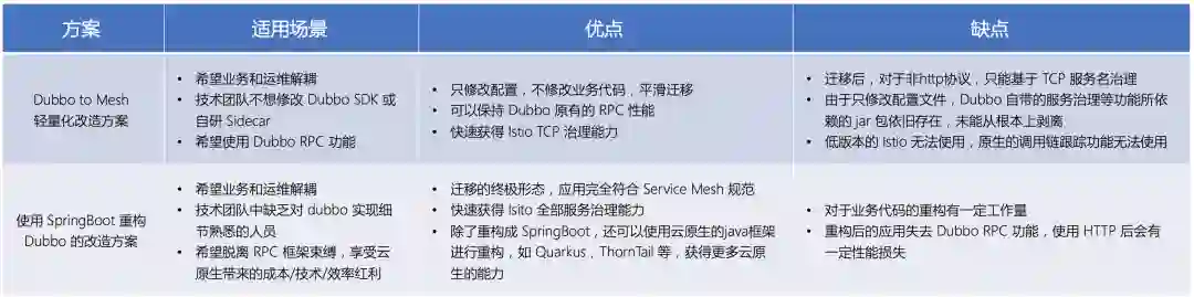 此方案充分利用 Dubbo 项目原有的代码结构,删除Dubbo原有的注册发现、Dubbo协议、Dubbo服务配置等功能,将一个 Dubbo 项目改造成一个 SpringBoot + K8S + Istio 的项目,代码修改范围可控,改造方式最彻底。