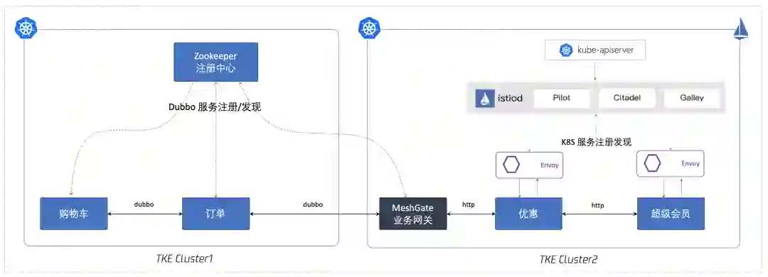 利用 Dubbo 本身的能力,修改配置文件以禁用 Dubbo 本身的注册发现,并通过指定服务名调用 Dubbo 服务。使用这种方法可以将Dubbo 应用快速部署到 Istio 集群中,不改变通信协议,并实现基于服务名的流量控制。本方案在 Istio 1.5+ 中实验通过。