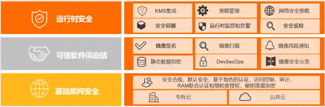 可信软件供应链:通过镜像扫描发现已知安全漏洞;通过镜像签名保障镜像来源的安全性及不被篡改;通过DevSecOps集成,实现安全左移,与开发、测试、运维等质量动作进行深度融合。