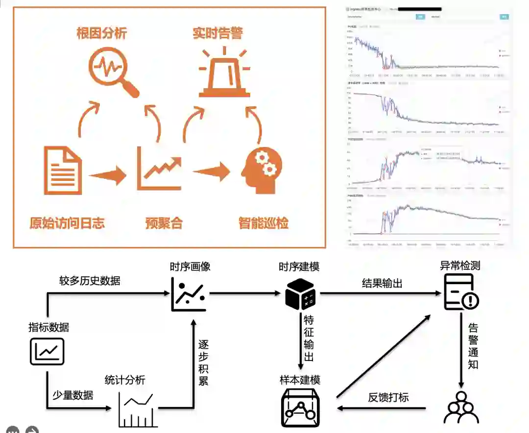 预聚和:由于原始访问日志量巨大,基于原始日志计算指标性能开销较大,因此我们专门推出了基于访问日志的指标预聚和能力,能够将上百万甚至上亿的访问日志实时聚合成指标类型的时序数据,数据量会降低1-2个数量级,后续的分析与监控可直接基于时序数据进行,大大提高效率。
