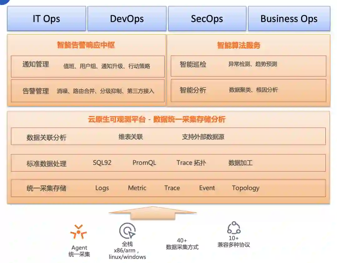 统一存储分析层:提供了针对Logs、Metric、Trace、安全事件、Topo等多种数据的存储层,并且在此基础上提供了统一的数据关联分析能力。对于不规则数据,提供了数据加工能力。