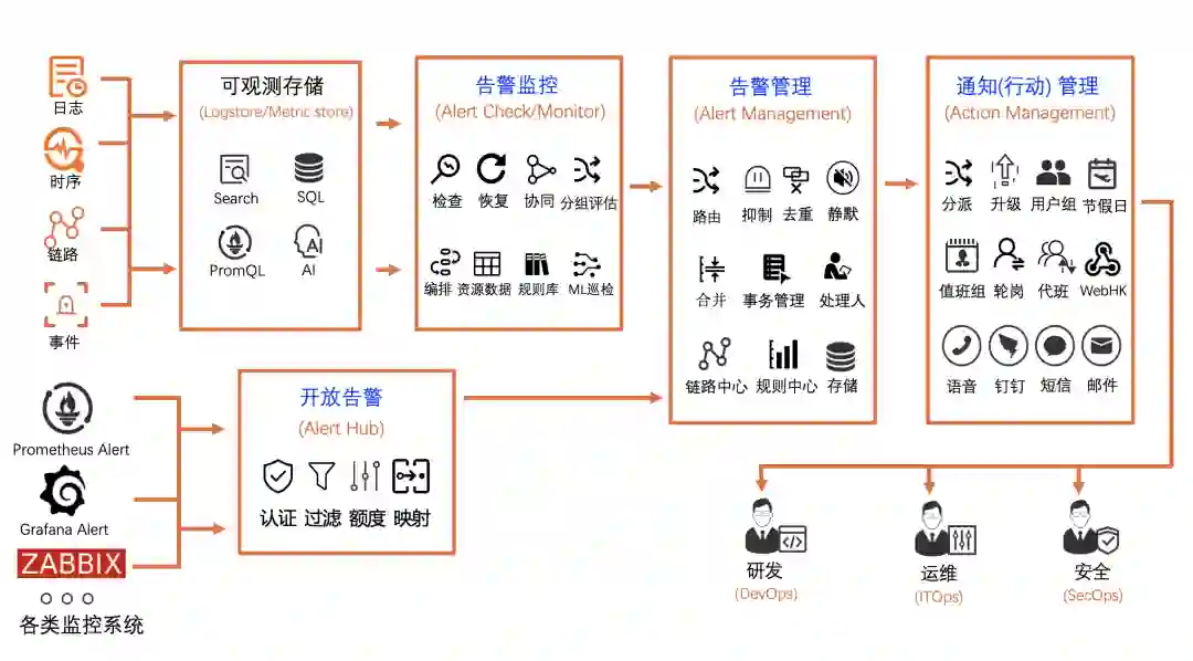 多渠道:支持短信、语音、邮件、钉钉、企业微信、飞书、Slack等多种通知渠道,同时还支持通过自定义 Webhook 进行扩展。同一个告警,支持同时通过多个渠道、每个渠道使用不同的通知内容进行发送。例如通过语音和钉钉来进行告警通知,既可以保证触达强度,又可以保证通知内容的丰富程度。