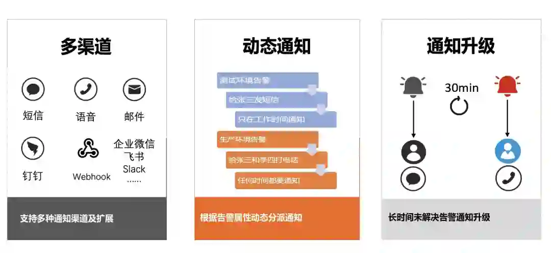 动态通知:可以根据告警属性动态分派通知。例如:测试环境的告警,通过短信通知到张三,并且只在工作时间通知;而生产环境的告警,通过电话通知到张三和李四,并且无论何时,都要进行通知。