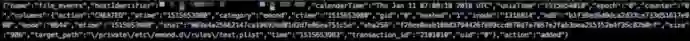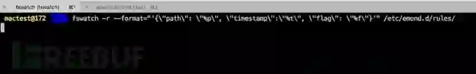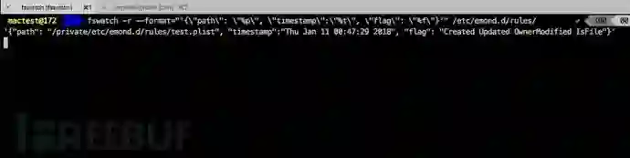 你可以注意到fswatch可以在事件触发时提供时间戳。 此外,你可以将其输出到任何其他命令行,以便进一步处理。 你也可以指定多个目录进行监控。 下图显示了一旦我们在rules目录中放置了一个plist文件,fswatch将以一个JSON字符串显示事件详细信息。