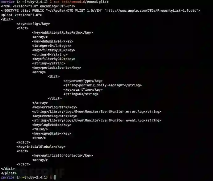 emond是一个普通的守护进程,每次系统启动时都会由launchd执行,其对于launchd的配置文件和其他系统守护进程在同一个地方:/System/Library/LaunchDaemons/com.apple.emond.plist,该配置文件决定了何时执行emond,并带有LaunchDaemons经常使用的任何期望的选项。 emond.plist配置文件位于/etc/emond.d/目录中。该文件定义了规则路径,UID/GID过滤,错误日志和事件日志路径以及一些其他选项。
