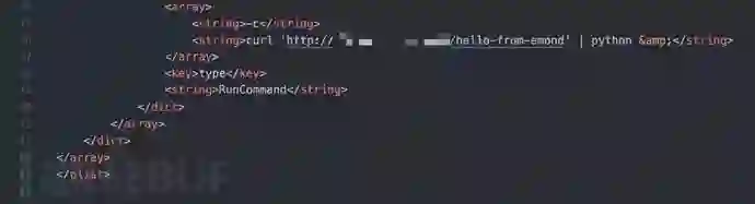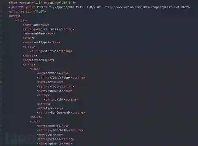规则文件被存储在/etc/emond.d/rules/目录中,且应该为plist格式。在该目录下已经有一个示例规则文件了(SampleRules.plist),该示例定义了名称,类型和事件触发后的操作。事件有几种类型(startup, periodic, auth.success, auth.failure等),在这次的演示中我们只使用startup。一旦被emond加载,startup事件类型就会触发规则;periodic事件类型只有在定义了“startTime”之后才会触发;同样的,auth.success事件类型只会在用户成功验证后触发;auth.failure会在验证失败事件上触发,还有其他的一些事件类型就不一一列举。action定义了事件发生后emond将要做什么,需要注意的是,我们可以在规则中定义多个action。只有少数action可以被用于恶意目的(如运行命令和发送电子邮件),你可能已经猜到了,运行命令可以允许你执行任意系统命令,对于发送电子邮件,目的不言自明。对于本演示,我们将重点介绍执行命令。