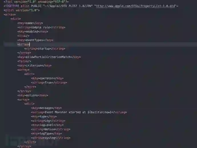 现在我们可以演示如何利用事件监视进程来建立持久化访问。 emond的机制与其他任何LaunchDaemon相似。 Launchd负责在启动过程中执行所有LaunchDaemons和LaunchAgent。 由于emond是在该过程中启动的,所以当使用执行命令时,应该注意一下你正在执行什么命令,以及在哪一个过程应该执行哪个命令。 这一点非常重要,因为事件发生然后触发action(执行命令)的时候电脑很可能没联网,所以任何需要网络访问的命令都没法用。接下来,我们会展示如何创建规则文件。