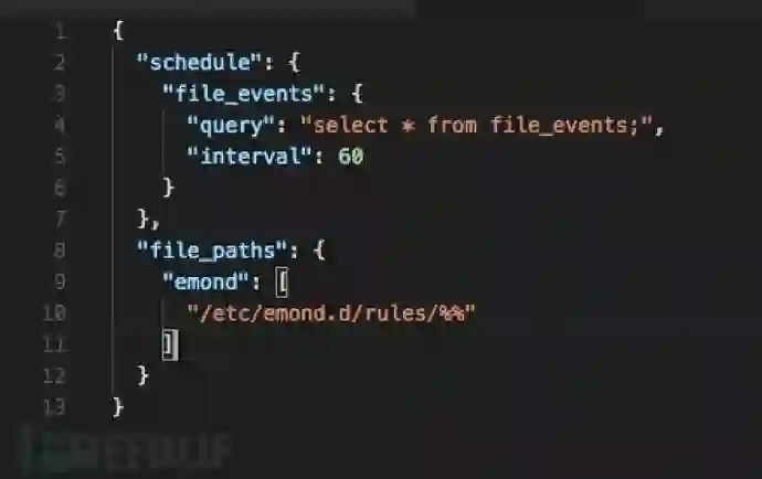 当然这只是一个最基本的例子,可能不适用于部署在大型MacOS环境中。对于后者,更适用的选择是osquery。Osquery提供文件完整性监视,它使用fsevents api将文件系统更改记录到特定目录的文件。 更多信息可以点击这里。安装osquery之后,你需要提供一个配置文件来监视文件系统事件。 下图是一个简单的示例来监视rules目录中的所有文件系统事件。 所有事件将以60秒为间隔进行查询。