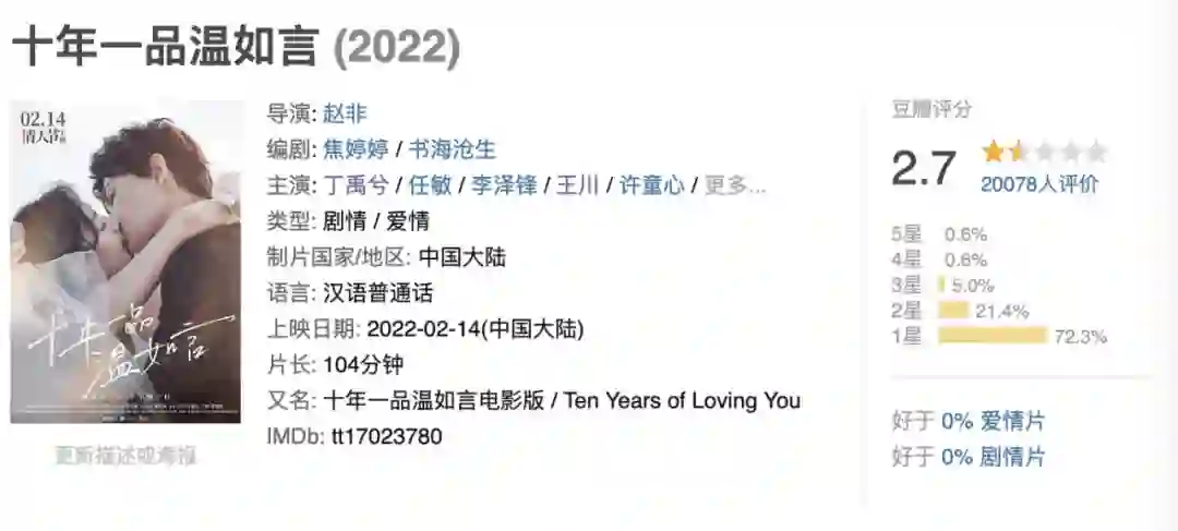 但谁知,三部爱情片口碑集体崩盘,上映当天就频频被骂上热搜,《十年一品温如言》甚至开出了近年来豆瓣罕见的低分2.7。