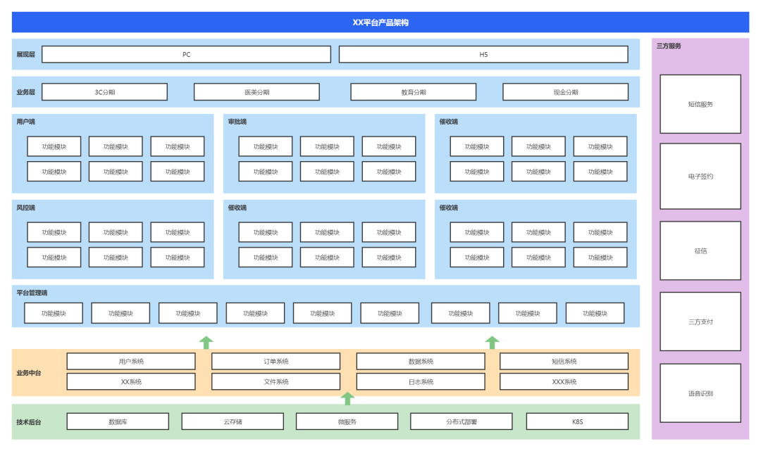 技术层,也是模块化思维,但是更底层,比如这些系统里面都会用到IM、规则引擎、文件管理、日志、通知等。还有一些如数据库、存储、微服务、分布式部署,这些需要技术来协助,产品架构图里也不一定要体现。
