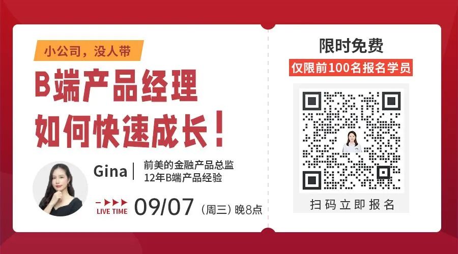 9月7日(周三)晚8点,前美的金融产品总监@Gina老师,1个小时直播分享,用1小时教你一套能力提升的方法,帮助你突破职业发展瓶颈,实现职场跃迁~
