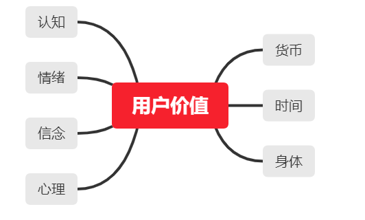 用户价值,根据分类,可以分为货币、时间、身体、心理等,用户又分为C端用户和B端用户,C端用户更关注的价值面更多,除了时间和货币外,还有情绪、心理、信念等,而B端用户关注的更多是货币和时间。