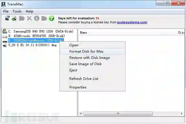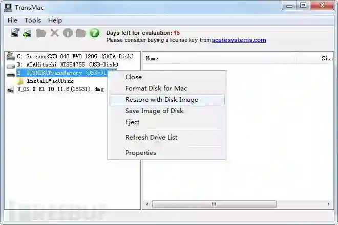 之前我们在Windows下写入Win镜像使用Win32diskimager,或者UltraISO,现在我们要在Windows下写入MacOS的镜像系统,得采用TransMac这款软件。