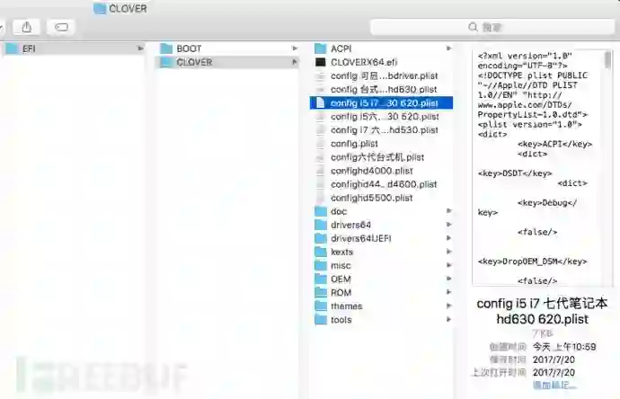 烧录完成之后,需要进入PE系统,找到U盘的EFI引导分区,给clover引导器选择一个适合你机型的配置文件,最新的或者较新的Intel的CPU都可以支持,不管是台式的还是笔记本,都可以支持。具体的操作是进入EFI/CLOVER文件夹,删除默认的config.plist文件。选择正确对应你的机型的CPU的plist文件,重命名为config.plist即可。文件夹的结构图如下图c所示。