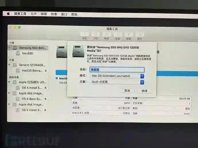开始进入黑色滚屏,大概五六分钟之后,出现macOS实用工具界面,在这里我们把磁盘准备好,否则后面安装过程中无法选择安装磁盘。选择我们的SSD点击“抹掉”,名称改成你喜欢的名字,方案要改成“GUID分区图”,如下图e所示。