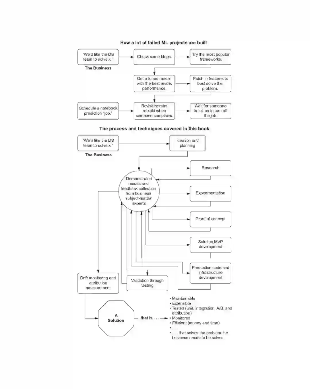 - 第2部分(第9-13章)介绍了ML项目的开发过程。通过ML解决方案开发的示例(好的和坏的),本节将带您了解经过验证的构建、调优、日志记录和评估ML解决方案的方法,以确保您构建的是最简单和最易维护的代码。