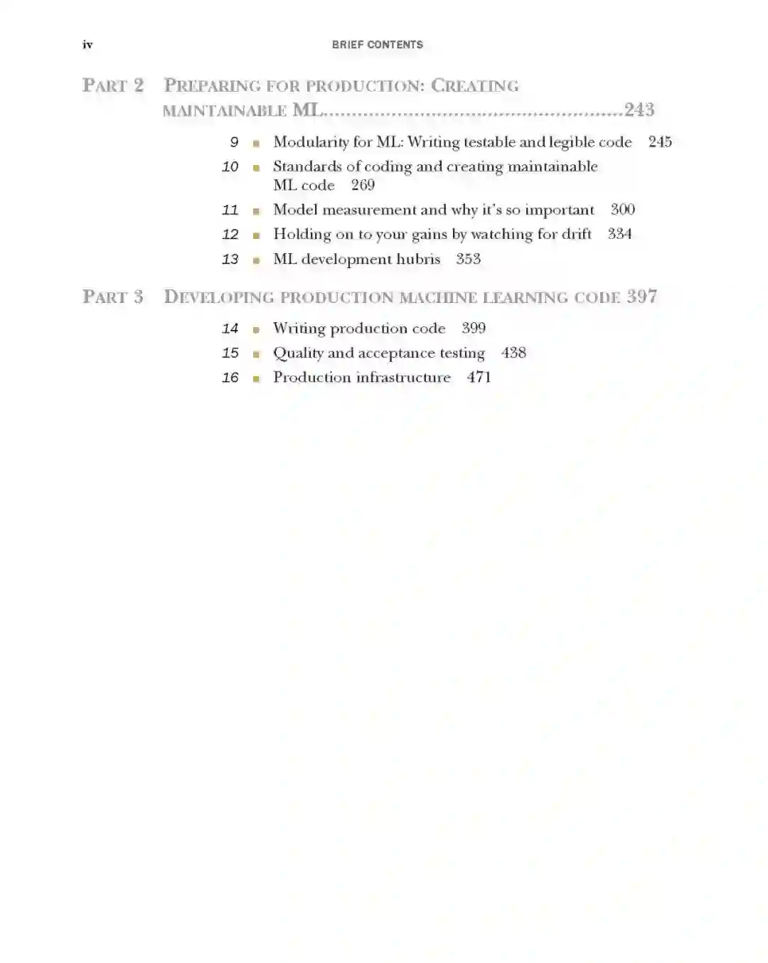 - 第3部分(第14-16章)关注“之后”:具体地说,与简化产品发布、再训练、监控和项目归属相关的考虑。通过重点介绍A/B测试、特征存储和被动再训练系统的示例,将向您展示如何实现系统和体系结构,以确保您正在构建最低限度复杂的解决方案,以使用ML解决业务问题。