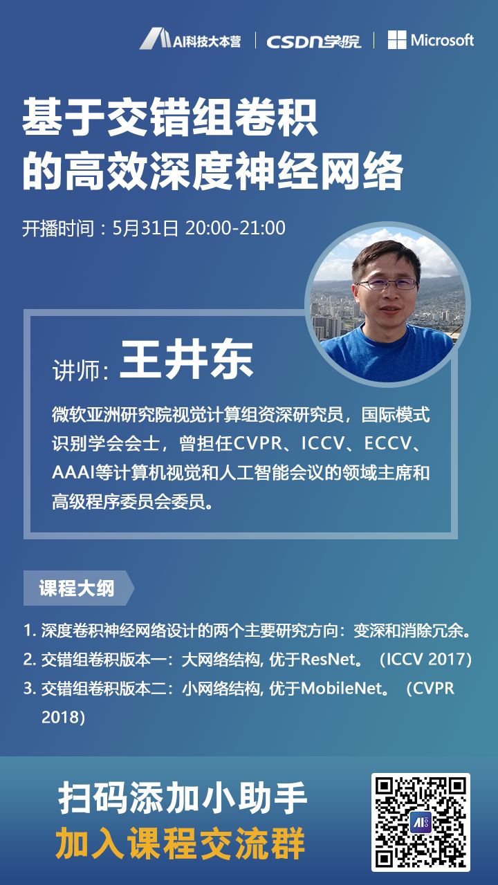 如何消除消除卷积核的冗余性?我们邀请到微软亚洲研究院视觉计算组资深研究员王井东,他将在 31 号的直播公开课中为大家讲解发表在 ICCV 2017 和 CVPR2018 上基于交错组卷积的方法,这种方法优于 ResNet 和 MobileNet。