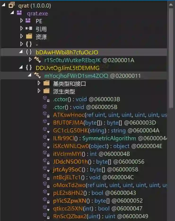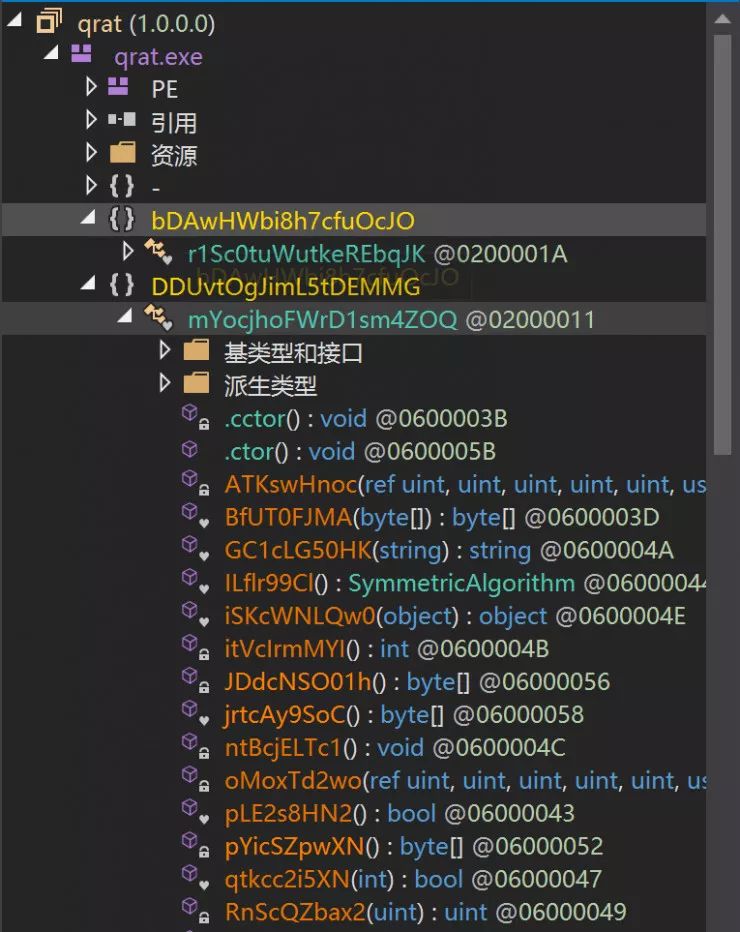 a. Word文档被打开后,会通过触发漏洞释放并运行qrat.exe,样本为C#开发,并做了混淆以防止被分析。