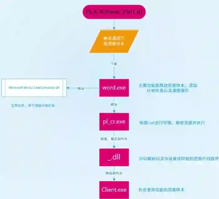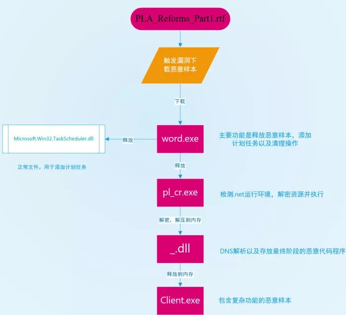 与2017年12月捕获的样本不同的是,此次样本较早期样本解密流程更加简洁,木马后门不在内存解密执行,而是落地后直接运行。流程对比图如下: