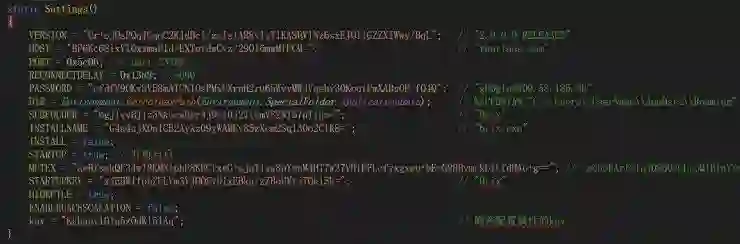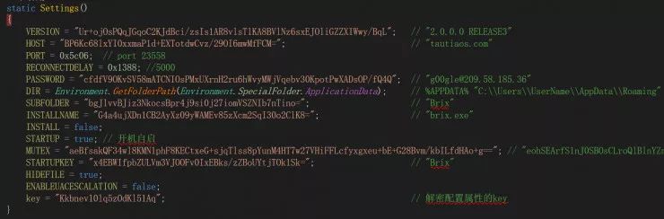 a. 样本从编译时间来看是2018年1月23日,同样采用C#编写,也同样做了混淆,去掉混淆后发现该样本为远控木马。木马采用开源远控xRAT的源码编译,一直被“白象”团伙所使用。此次木马在功能能上相比去年12月份的样本,并没有什么功能性的变化,但是对配置文件选项进行了AES加密,并进行了Base64编码。如下图所示:
