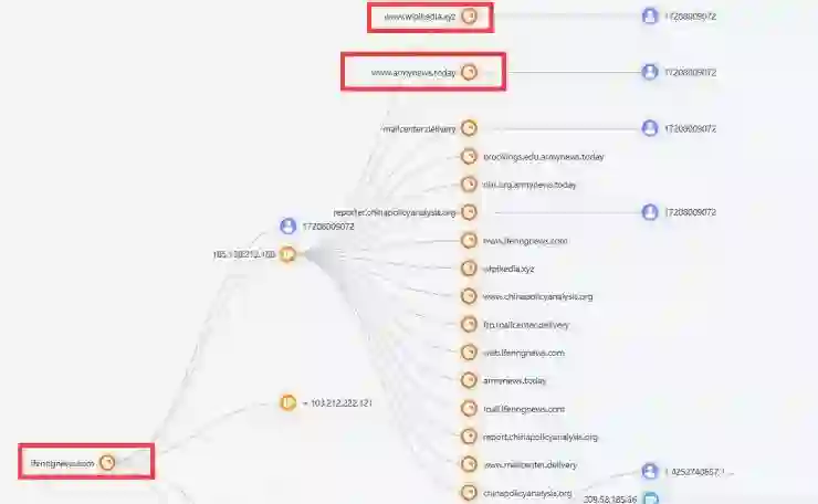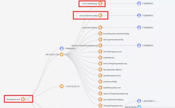 对此次涉及的恶意域名ifenngnews.com、chinapolicyanalysis.org关联发现,除datapeople-cn.com、sinamilnews.com、ustc-cn.org等大批我们此前已经掌握该团伙资产外,我们还发现了包括wipikedia.xyz、armynews.today等多个于2018年1月19日最新注册的可疑域名,从域名注册商、服务器信息等特点研判认为,这些域名仍为“白象”团伙所有,如下图所示: