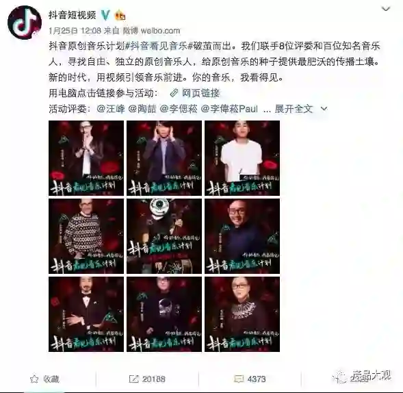 2018年1月25日,抖音推出抖音原创音乐计划,联手8位评委和百位知名音乐人,寻找自由、独立的原创音乐人。一方面给原创音乐人提供出口,另一方面扩充抖音自身社区的音乐库,利人又利己可谓一举两得。