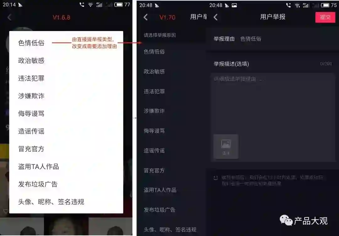 在V1.70版本中,细化了举报及评论模块,更精细化的进行社区管理,同时需要提供举报理由,增加审核可信度。笔者推测起初是根据举报标签数量进行的自动化封账号管理,这种可能会存在有组织的恶意举报,导致用户无辜被封,带来用户不满,随着视频量激增,这种未经审核的处理办法,一方面增加后端客服成本(当然,如果抖音根本没专门设置客服人员的话,也会带来用户流失的风险),另 一方面不便于追溯被举报原由,无法进行后续的账号复通工作。
