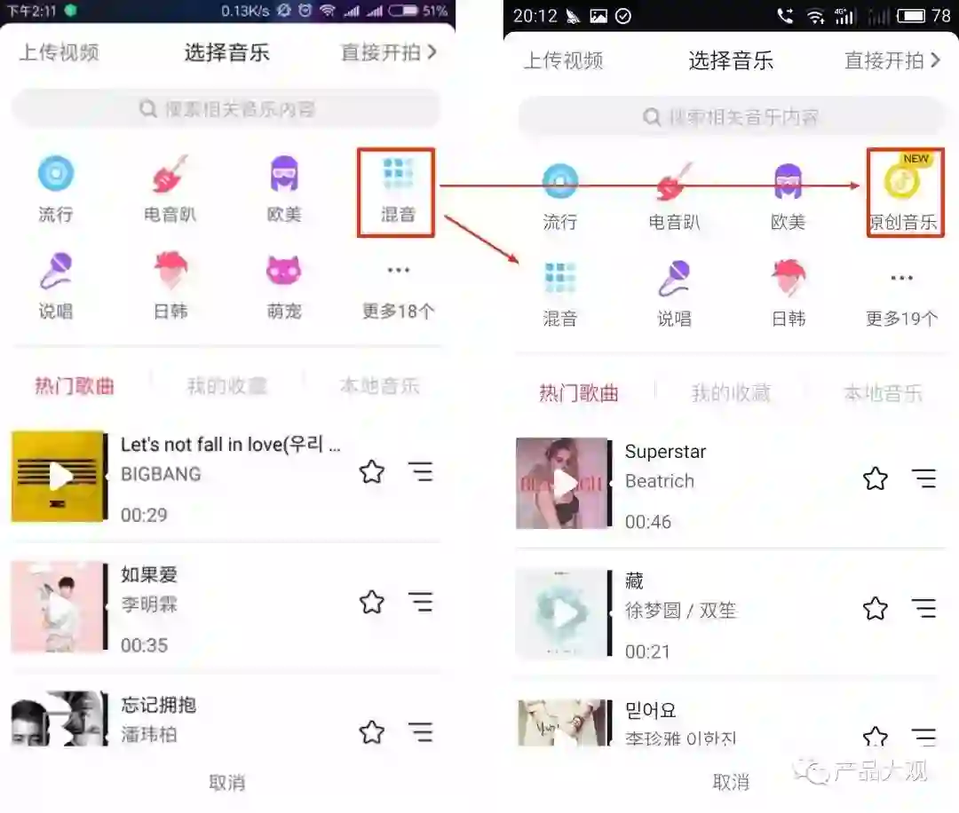 3. 前面讲过音乐版权及数量的问题,可以看出抖音团队通过支持导入本地音乐、发起原创音乐创作活动等来尽可能的解决以上问题,但是,目前来说效果还不得而知,更长远的角度来说通过资本购买大量音乐版权应该是主流路线,同时通过算法个性化推荐拍摄音乐,激活长尾音乐的使用频次。