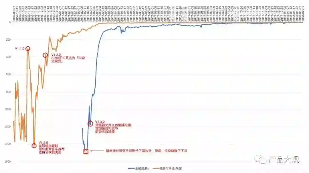 这一阶段,抖音短视频在市场的整体影响力可以忽略,基本处于产品的方向摸索和探索期。虽然,从始至终的定位是一款年轻人的音乐短视频社区,但是,在前期产品的格调及用户的喜好方面仍然花费了一些时间探索,甚至对产品名称进行了更改(从A.me更改为抖音短视频)。