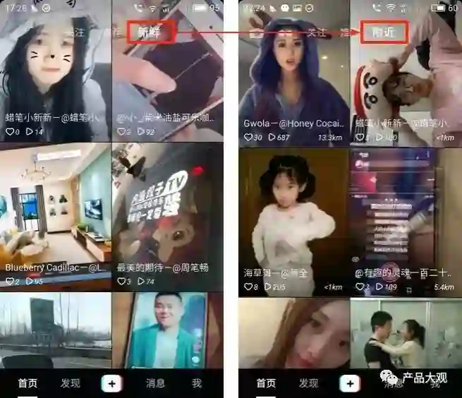 在V1.4.5版本中,首页的『新鲜』更改为『附近』,宣传口径方面由最新精彩内容看不停更改为发现身边有趣的人。这一改动笔者认为首页已经有推荐页了,而且用户的主要浏览也是在推荐页,新鲜和推荐页覆盖达人视频一定程度上重叠,新鲜页面后台数据反馈用户使用量不高(猜测);同时,抖音内部一直在加强产品的社交属性,附近页面能够勾起大众对身边达人的好奇心,更愿意去观看身边的人的故事,另一方面,增加达人在附近人群的曝光量,其实也是一种流量分发机制。