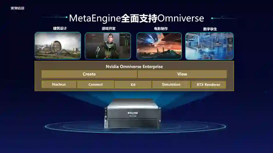 当前,元宇宙服务器MetaEngine全面支持英伟达的Omniverse企业版,这样将高性能GPU图像计算、AI计算、高速存储访问、低延时网络、精确计时结合,构成数据中心级的软硬件一体解决方案。
