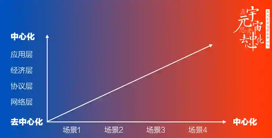 因此,肖风认为,要全面看待去中心化,要去其糟粕,取其精华,为我所用。建议用的方法如下面的坐标图:在横轴上,不同的应用场景中做好中心化或者去中心化的「区间匹配」,大部分的应用场景都应该是坐落在这两个坐标点的某一个位置;在纵轴上,做好不同网络层次中心化或者去中心化的「分层分级」,网络层可能更去中心化一些,而应用层可能更偏中心化一些。