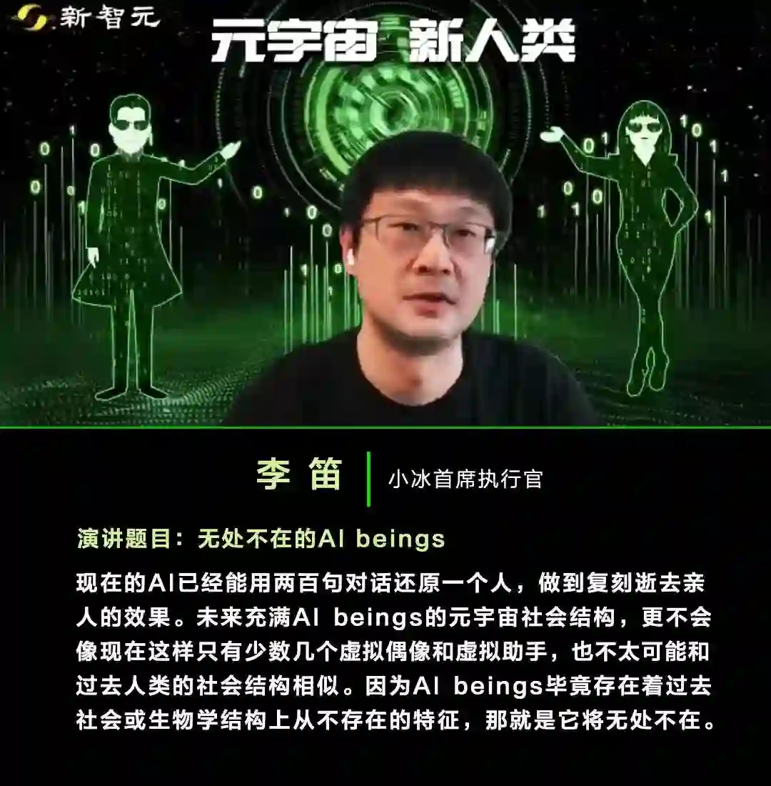 小冰首席执行官李笛谈到,之前认为新人类要描绘成非常科幻的一种感觉,现在却发现更有效果的新的可交互的主体,往往越接近我们越熟悉的交互主体,是非常接近人类的。新人类与传统人类存在最大的变异特征: