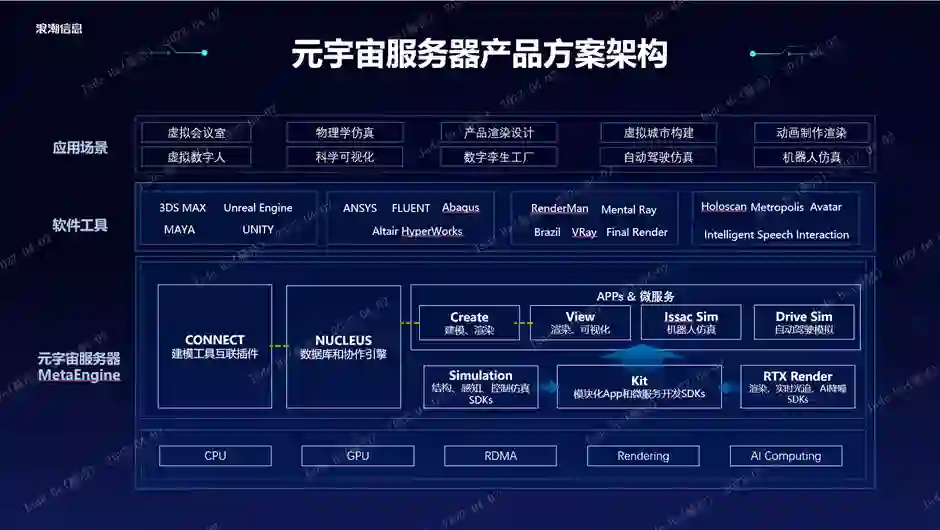 元宇宙服务器MetaEngine产品方案的架构方面,硬件采用了浪潮异构加速服务器的旗舰系统,支持最先进的CPU处理器和GPU加速器,拥有ADMA通信和数据存储能力,支持强大的渲染和AI计算。