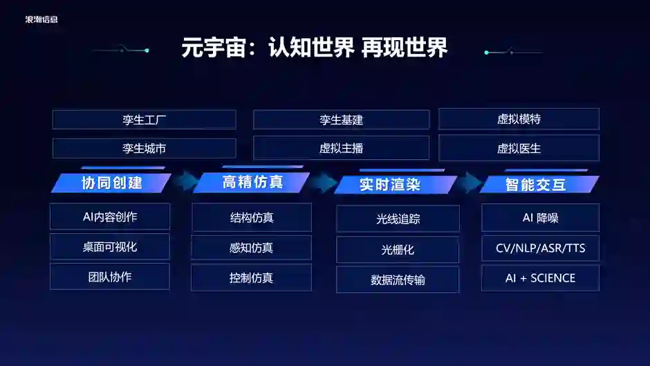 数字孪生和数字虚拟人仅是元宇宙数字载体的两个例子。元宇宙还是一个认知世界再现世界的过程。在这个过程涉及到协同建模、高精度仿真、实时渲染、智能交互多个环节。