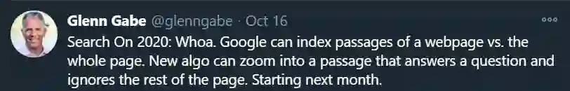 Search On 2020:谷歌可以索引一个网页的段落,而不仅仅是整个网页。新算法可以放大一段回答问题的段落,而忽略页面的其余部分。从下个月开始。