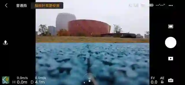 进入飞机界面就像是我们手机的相机系统一样,在左上角是低速、普通、高速模式选择。左下角是地图(需要室外有 GPS 才能正确定位)和高度距离以及速度等,右上角是电池,GPS 信号等等,左侧是飞机起飞和降落按钮,右侧是相机设置,可以对视频分辨率选择和拍摄按键等操作。右下角是曝光锁定。