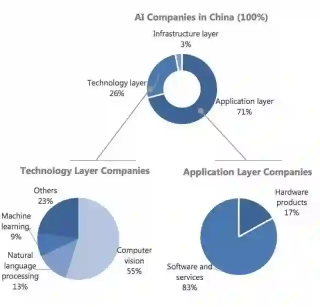 2.技术层:中国所有AI公司的26%主要从事计算机视觉、机器学习、NLP