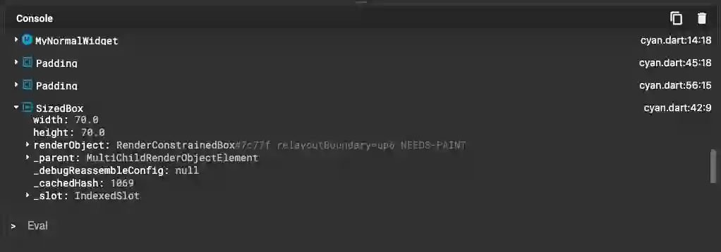 性能并不是您需要调试的唯一方面。此版本的 DevTools 提供了一项 Widget Inspector 更新,当您将鼠标指针悬停在 widget 上,可以评估对象、查看属性、widget 状态等。