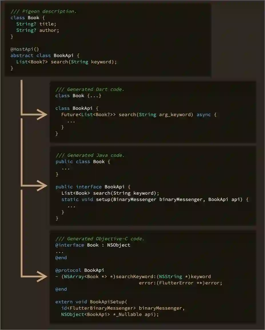 如果您开发的是插件而不是应用,则可能会对 Pigeon 1.0 版本感兴趣。Pigeon 是一个代码生成工具,用于生成 Flutter 及其主机平台之间类型安全的互操作性代码。借助该工具,您可以定义插件 API 的说明,并为 Dart、Java 和 Objective-C 生成框架代码 (分别可用于 Kotlin 和 Swift)。