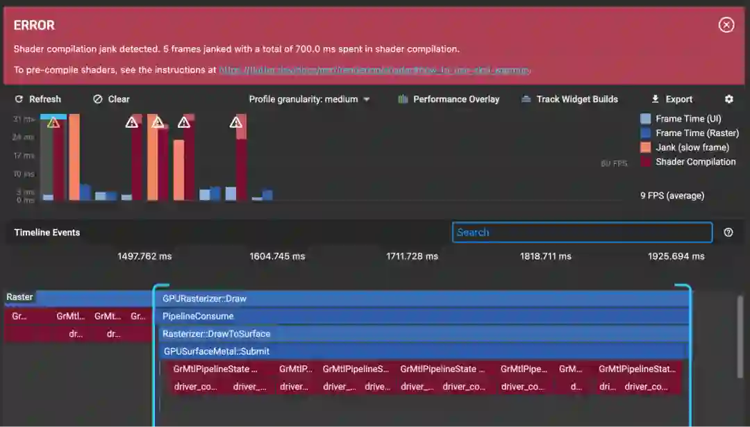 此版本实现了多项性能改进。首先是一个用于从离线训练运行中连接 Metal 着色器预编译的 PR (#25644),这 (如我们的基准测试所示) 能够将最坏情况下的帧光栅化时长缩短 2/3 秒,并将第 99 个百分位的帧时长缩短一半。我们在减少 iOS 卡顿方面取得了持续性的进展,此 PR 意味着我们在这条道路上又前进了一步。不过,着色器预热只是造成卡顿的原因之一。以前,处理来自网络、文件系统、插件或其他 isolate 的异步事件可能会导致动画中断。这是造成卡顿的另一原因。此版本对 UI isolate 事件循环的调度政策 (#25789) 进行了改进,现在,帧处理的优先级高于其他异步事件的处理,在我们的测试中,并未因此造成卡顿。