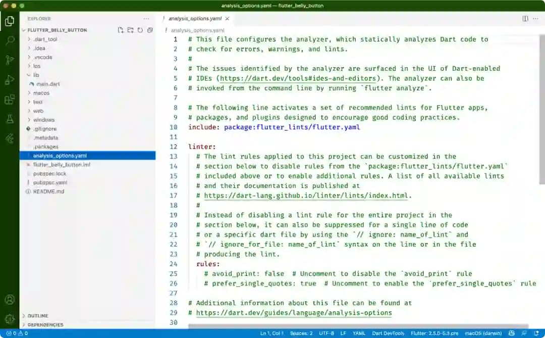 △ 'flutter create' 开箱即有一个 analysis_options.yaml 文件,预先使用了推荐的 Flutter lint