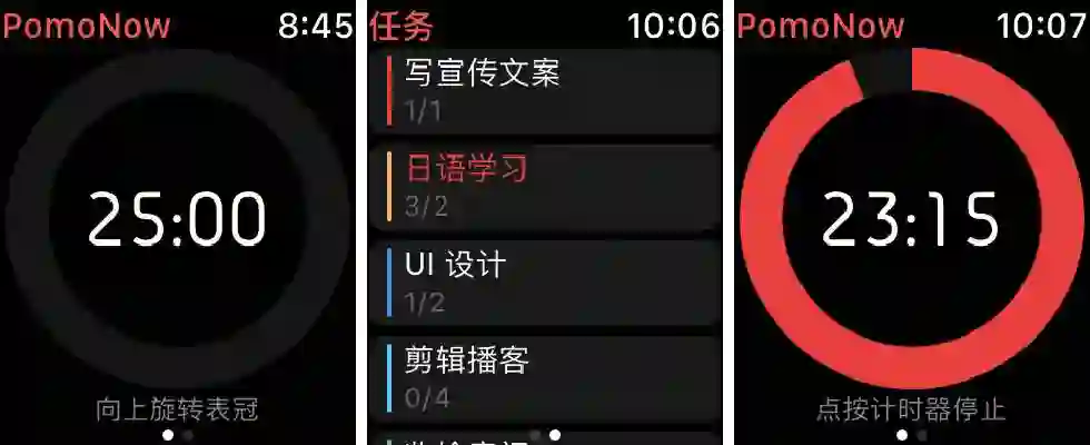 PomoNow 是我的一款集成 Todolist 的番茄钟应用,主打「平衡了仪式感和功能性」的交互设计,不仅能够让新手立即开始使用番茄工作法,也具备很高的灵活性,适合于各层次番茄工作法用户。目前我 Mac 版本以及同步功能正在开发中。具体介绍见:PomoNow 2,给你一个有仪式感的番茄钟丨Matrix 精选,Watch 版本使用效果见:微博视频