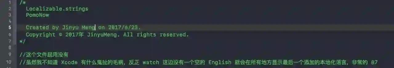 一般来讲,除 Storyboard 外,我们是不需要提供未翻译的语言文件的,因为在调用字符串的语句中就已经包含了未翻译的字符串。一条典型的语句如下:(这个「Time to work!」就是原文。)