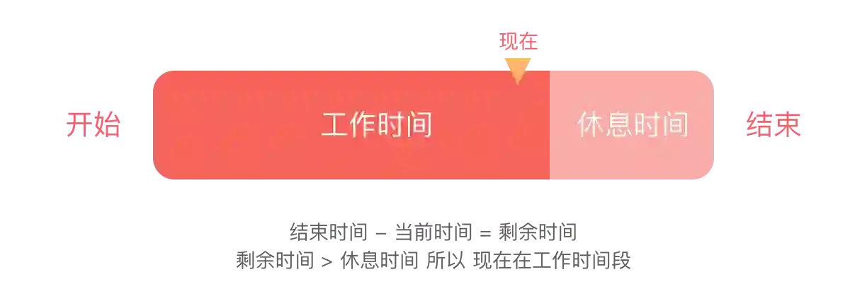 按照上图的思路,从前向后一个格子一个格子的扫描,在「当前时间」的指针进入我们扫描到的格子之后,我们就清楚的知道现在在工作还是在休息,以及还有多长时间了。