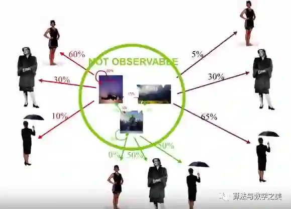 在这种例子中,不同类型的天气将成为我们的隐藏状态。晴天,刮风和下雨)和穿的衣服类型将是我们可以观察到的状态(如,t恤,长裤和夹克)。初始状态是这个序列的起点。转换概率,表示的是从一种天气转换到另一种天气的可能性。最后,发射概率是根据前一天的天气,某人穿某件衣服的概率。