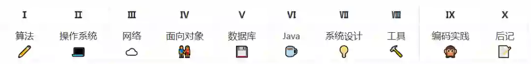 该项目的主体内容可分为 9 部分,其中算法介绍了基础的栈和队列、并查集、排序和查找等,操作系统介绍了现代计算机系统与 Linux 系统。其它如介绍了设计模式和基本思想的面向对象编程、世界上最先进的分布式版本控制系统 Git、以及 Java 和编程实践等都有涉及。