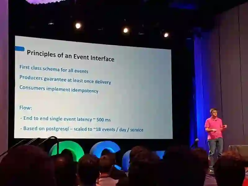 在接下来的演讲中,Bryzek 讨论了事件和事件流的重要性。对于人们提出的要访问 Flow.io API 的请求,他回应说,“我们提供了一组出色的 API,但还是尽量订阅我们的事件流吧”。事件接口的关键原则包括:为所有事件定义模式;生产者可以保证至少一次交付;消费者需要实现幂等性。在 Flow.io 的架构中,端到端的单个事件延迟约为 500 毫秒,基于 PostgreSQL 实现,每个服务每天最大规模约为 10 亿个事件。